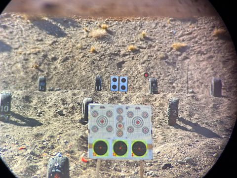 This is a picture through the spotting scope at 100 and 300 yard targets. In both cases, the Kestrel provided perfect ballistic solutions to hit dead center every time. If you click on this picture you can see the hits on the 8 inch plate at 300 yards. |