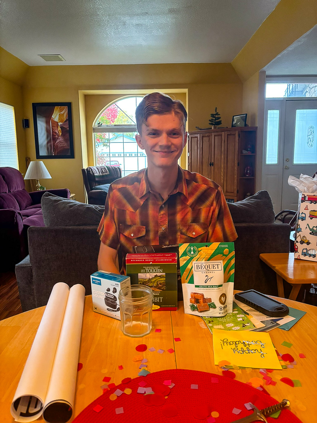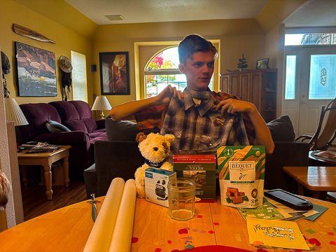 Caleb showing off his fun birthday gifts. |