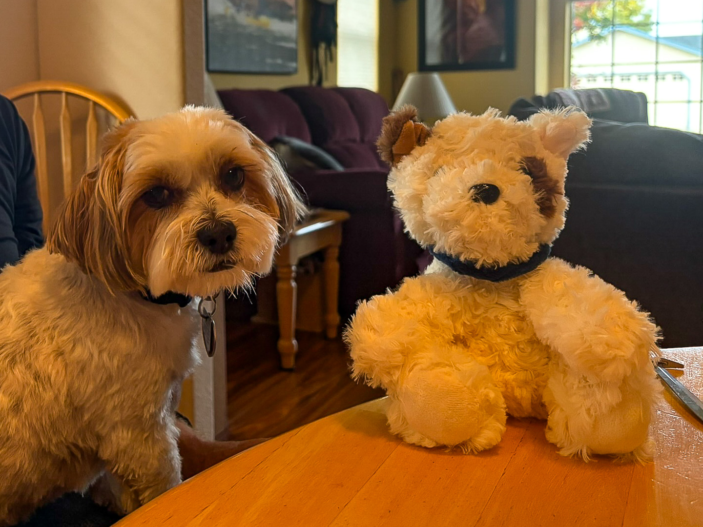 Our cute little Chester with a stuffed puppy who looks just like him. |