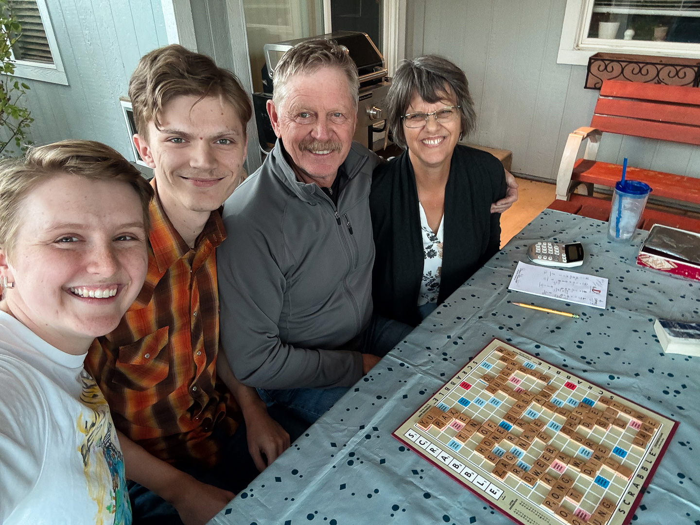 Thanksgiving games after our meal. We had a great time playing an amazing game of Scrabble (our family favorite) where we managed to get to all four corners of the board! The weather has been very mild and the fall colors beautiful, so we were able to play games on the picnic table in our back yard. |