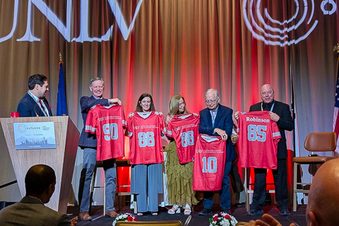 Bob's old workplace, the Center for Business and Economic Research at the University of Nevada, Las Vegas celebrated their 50 year anniversary at their Annual Economic Outlook on November 13th. In recognition of Bob's working 20 years of the Center's 50 years, Bob got to join other long serving staff for a little stage time. They each received football jersey's with the number representing the year they started working at the Center. |