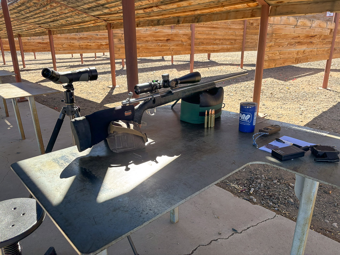 One of the great things about being retired is Bob can go out to our local shooting range whenever he wants to further dial-in his accuracy. On this day it was to try out his new Kestrel ballistics solution device (in the picture with the blue and white tether). The Kestrel is a weather meter that measures wind, altitude, pressure and all the other critical weather and ballistic variables to calculate an accurate aim point for long-range shooting. |